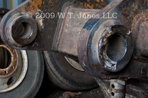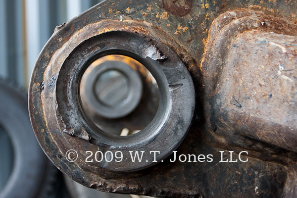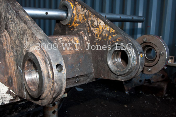 As you can see in this photo of the stationary half of the grapple, the pin bore is worn out egged shaped and the outside is scored form a makeshift pin retainer bolt that was installed to keep going until a shut down could be arranged.