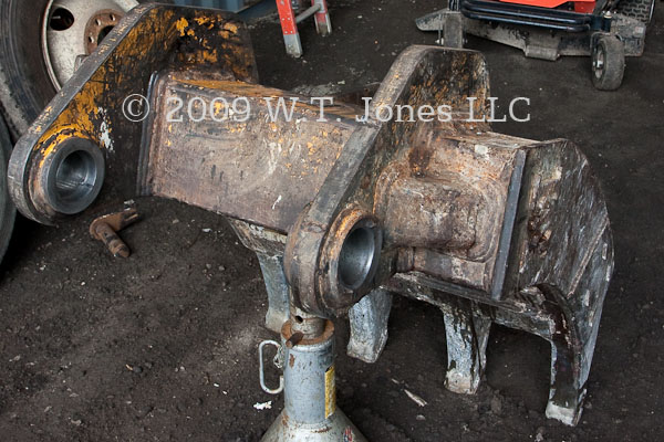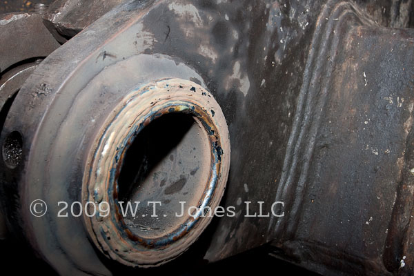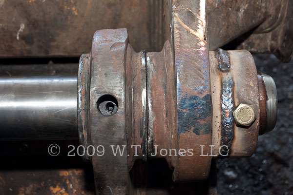 Here you can see that the faces are machined square and that the fit is close. There is no side to side movement anymore. When we started there was nearly 1/2 inch. You can also note the retaining pin collar that was fabricated to hold pin in place and keep it from rotating.