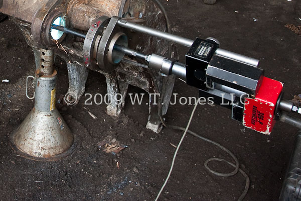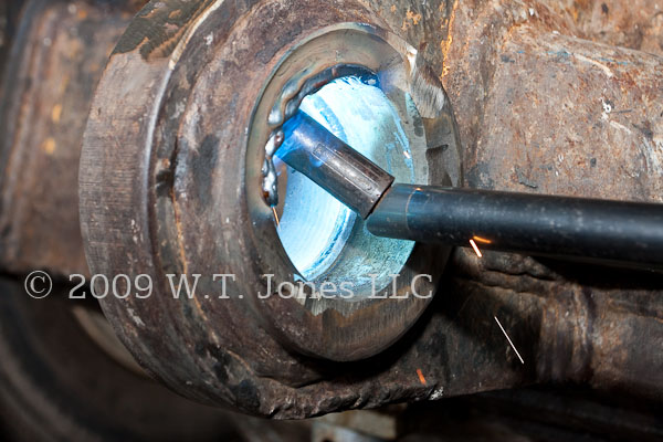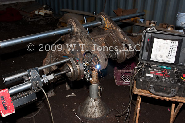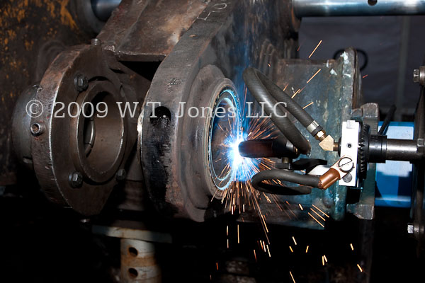 How do we repair the worn out hole you ask? There are a few options, but the best by far is to weld the bore and resize as required. First we clean and assess the damage. Then attach and align the portable boring bar components. I then set up the bore welder using the bar center as a reference. Below is the Bortech 306-P bore welding machine and a close up of the weld head. One simply adds as much weld as we need to make the bore small enough to machine to correct diameter.