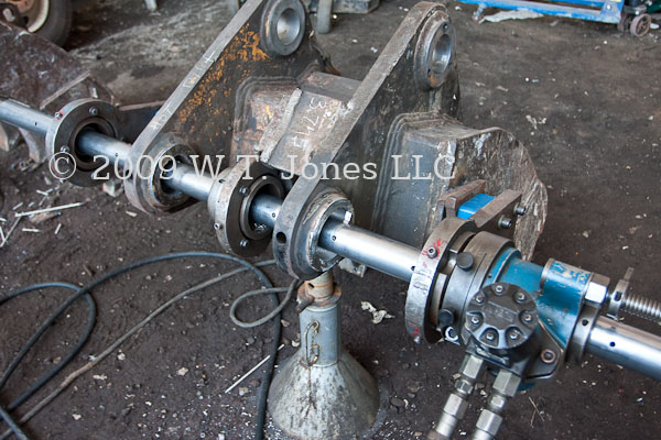 We have rebuilt all of their grapples at least once except this one. This unit was built by a now defunct company called Iron Works. They had a odd pin retention system that did not work out well at all. As a result over the years we made our own custom built pins with improved retention and use standard Caterpillar (Cat) hardened bearing sleeves in place of the supplied bronze bearings that the factory used. The use of Cat bearings simplifies parts supply. The pins are made from tool steel at a local hydraulic shop. This combination works out well and lasts as long as anything else.