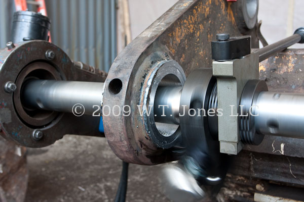 After the required welding is complete in the bores and on the faces, the boring bar is set back in place & machining is begun. First I machine the bores