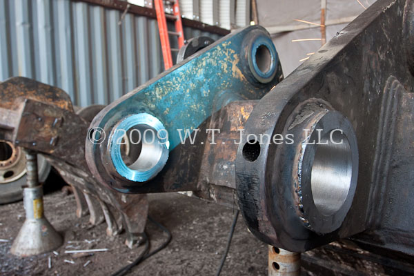 The bores and faces are complete and to size awaiting the press fit bearings and for me to clean up the edges some. You can see the sparks from the bore welder as I weld the H link pin bores.