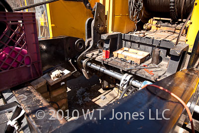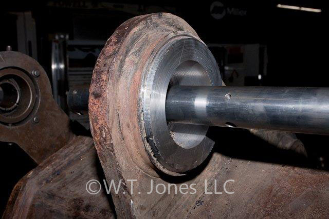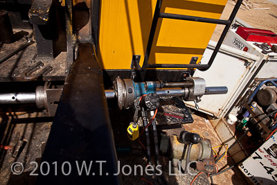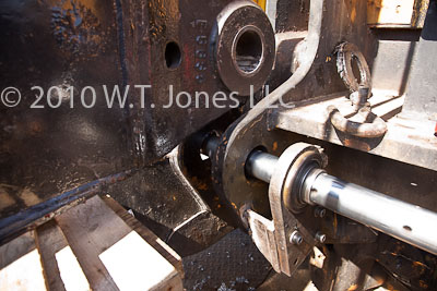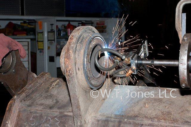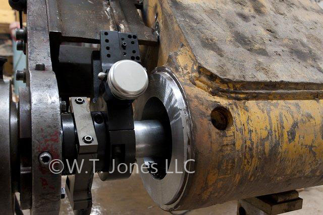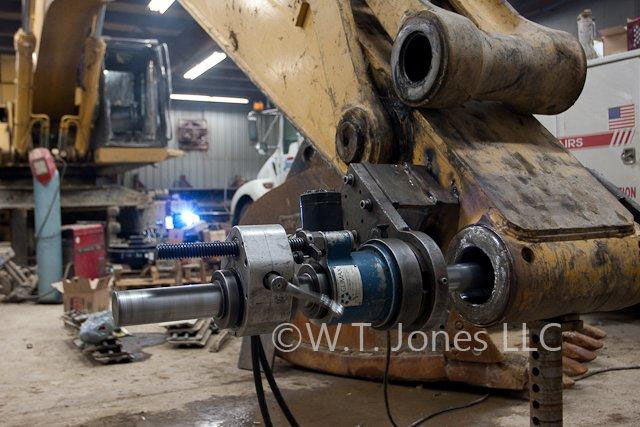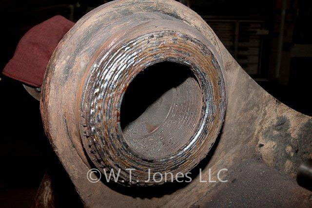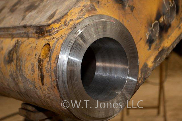 John Deer 450 excavator was in the shop for some major work. One job was to rebuild stick nose and bucket, there was over 3/4 inch of side play. The stick end was built up and the bores were welded. Then everything was bored & faced back to original dimensions. The bucket was also built up then subsequently bored & faced as required.